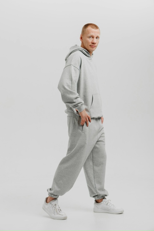Приятный, дышащий материал. Материал - "классическая трёхнитка", которая хорошо подойдет для демисезонного использования с осени по начало лета. Костюм без подклада, оверсайз.